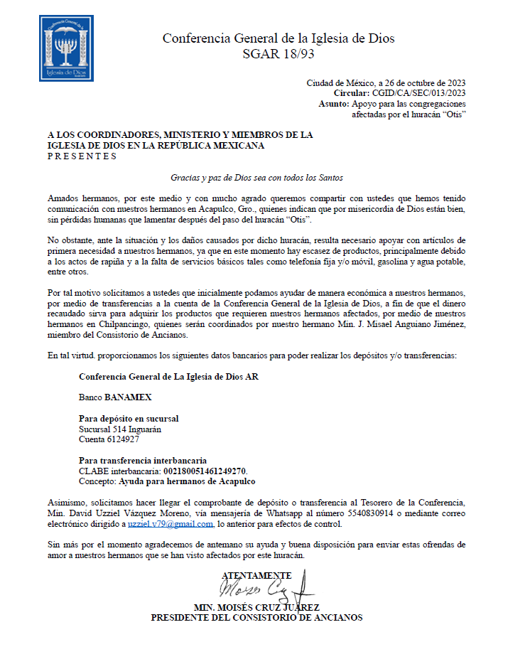 Circular - Apoyo Congregaciones Afectadas Huracán "Otis"